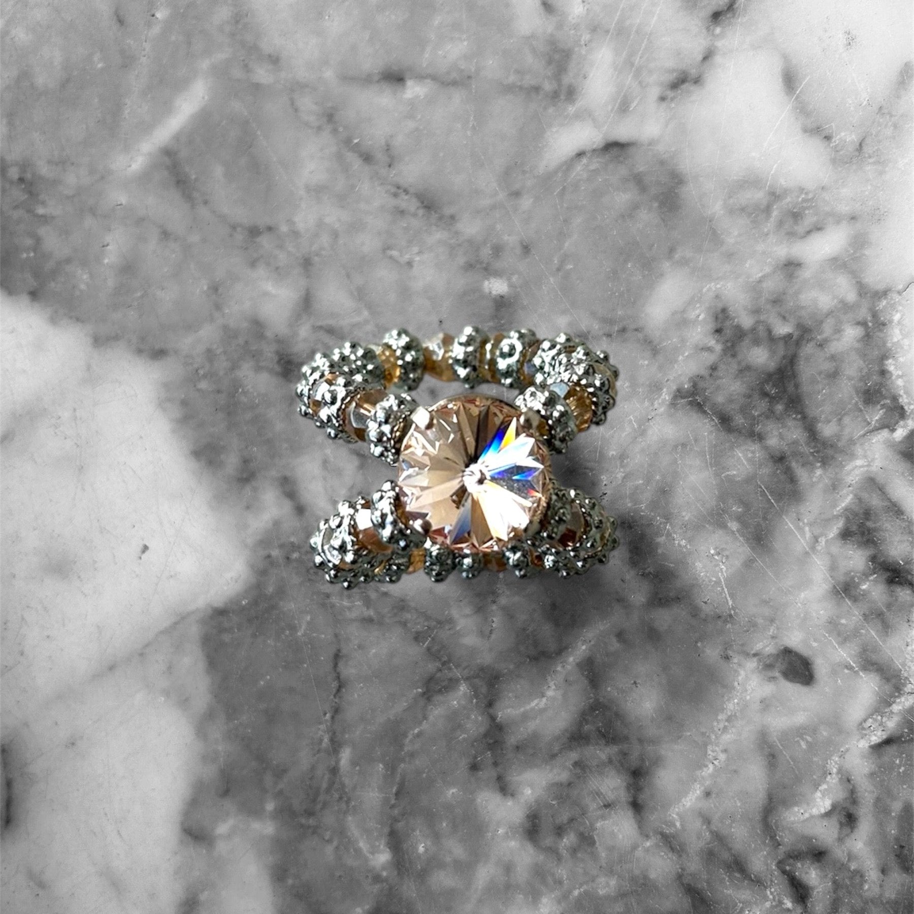 STRETCHY RING- Large beige round Swarovski stone with metal and crystal beads