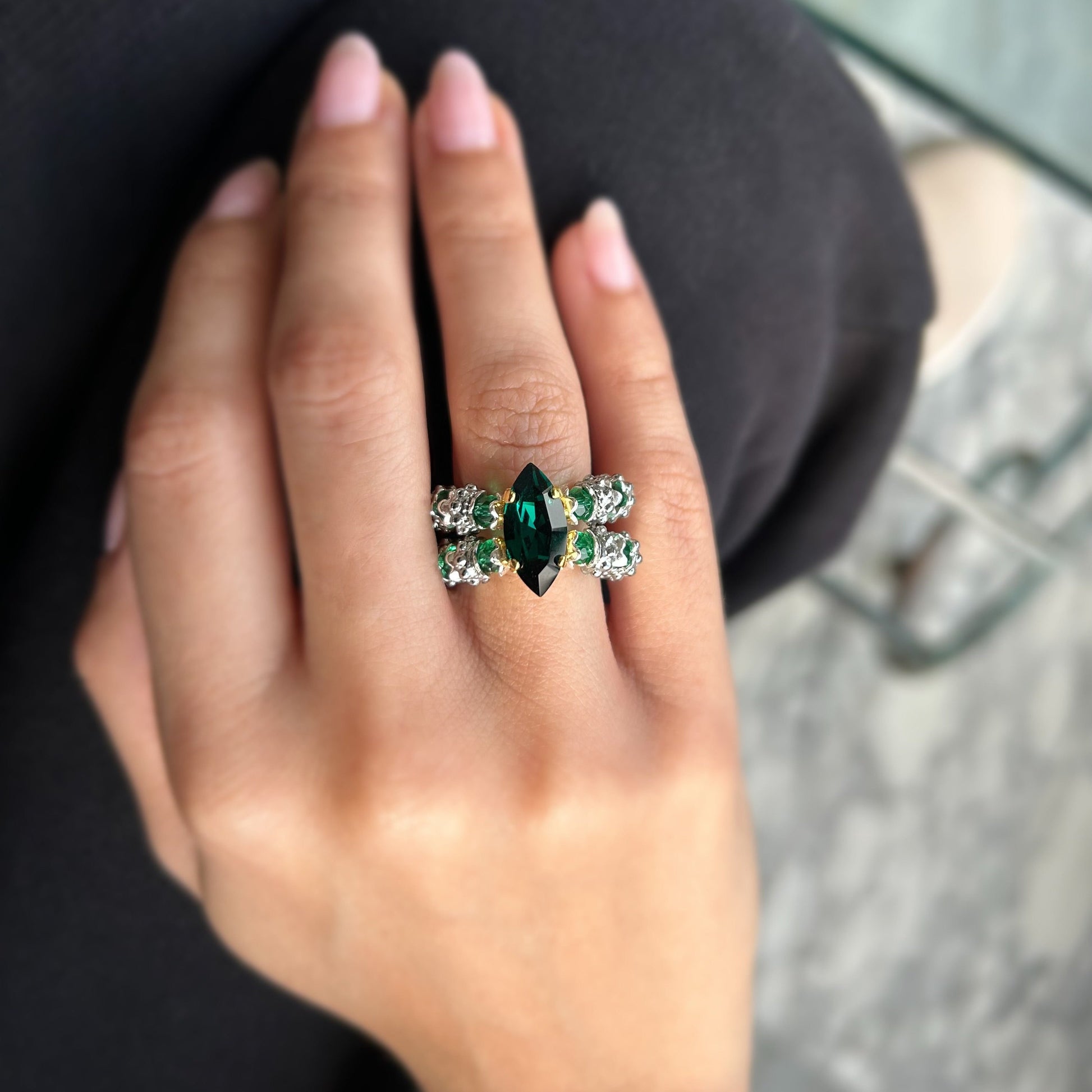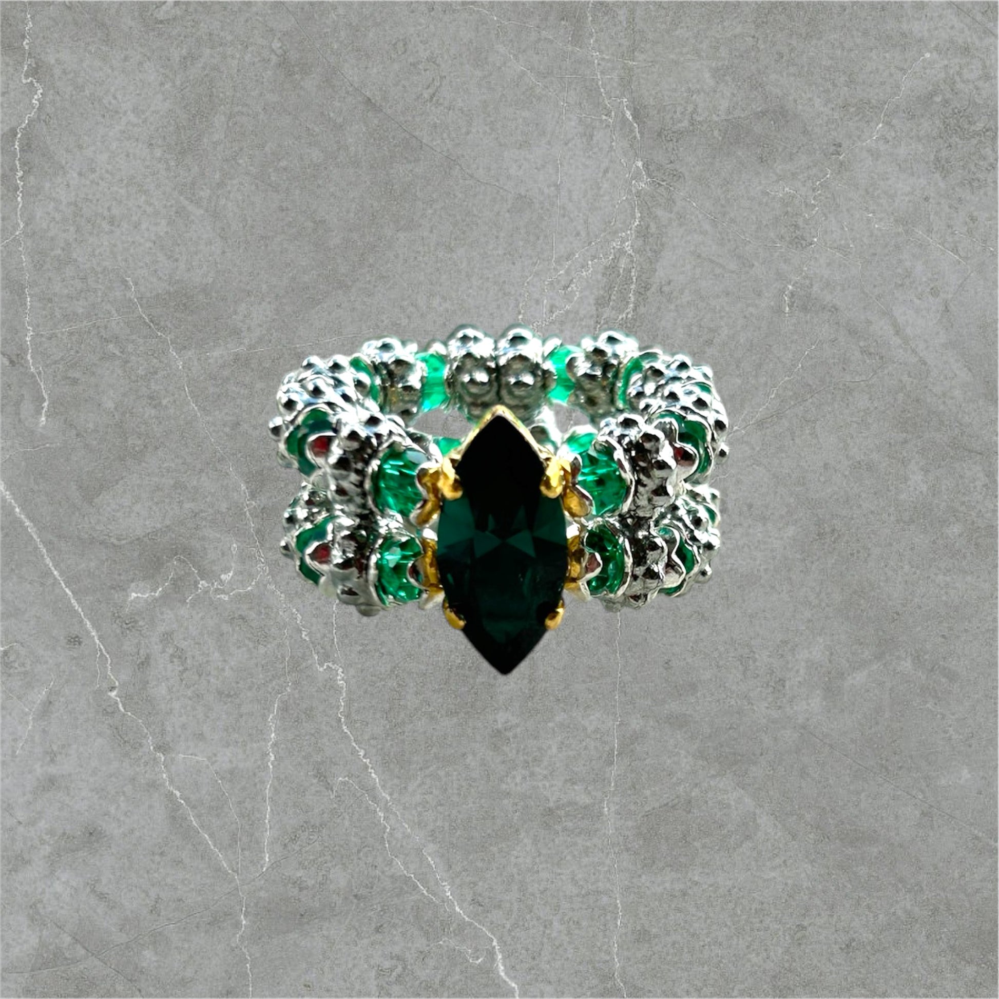 STRETCHY RING -Emerald green marquise Swarovski with metal and crystal beads
